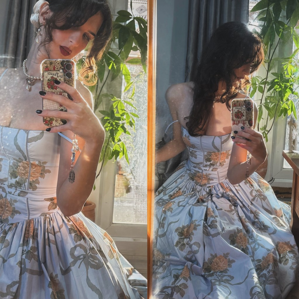 At twenty-four, I gravitate toward fitted pieces and softer silhouettes; dresses and skirts feel the most “me.” I’ve always loved neutrals, black, brown, ivory, cream, but I’m a prints girl at heart. Polka dots, tartan, florals, they all sneak their way in. Lace will always be one of my forever favourites; pearls too. I’m also hugely drawn to anything vintage-coded Victorian, Edwardian, that whole romantic, old-world influence. It shows up in my love for structured bodices, delicate trims, and anything that feels like it has a story stitched into it.